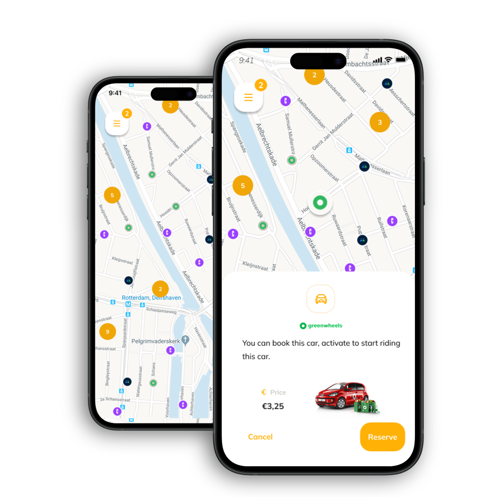 Figo offers access to all well-known shared transport providers via the app, such as MyWheels, Greenwheels, Check, and Felyx. And if you also purchase the TravelCard as a module, all other transport providers are also included.